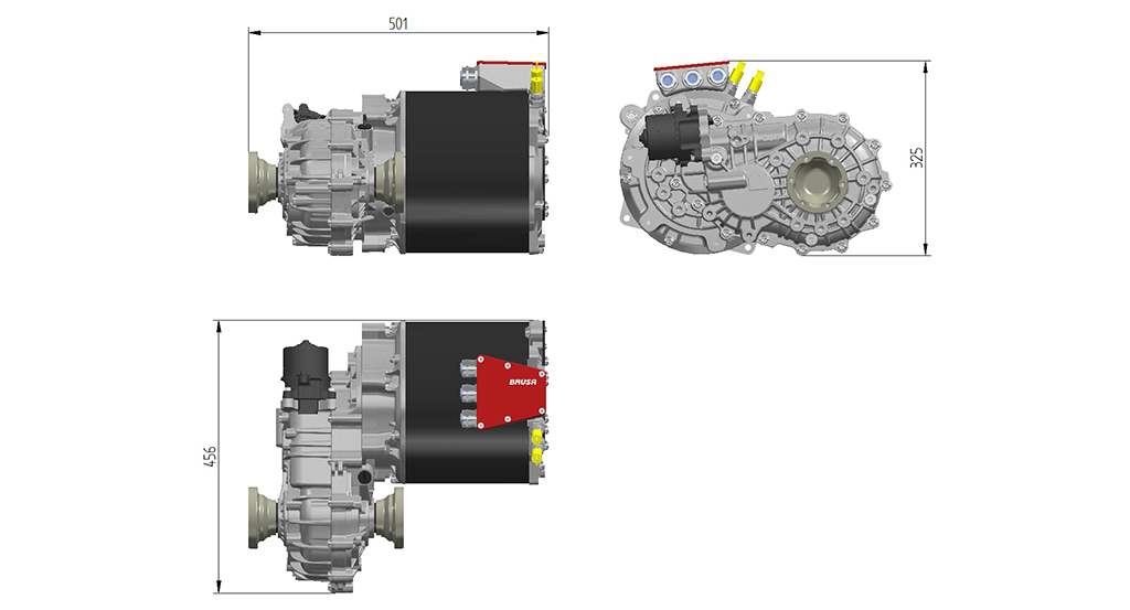 BRUSA Elektronik AG offers a specially designed gearbox for their drivetrain set. The compact design of the transmission in combination with the powerful motor results in a highly efficient power set for electric vehicles. The drivetrain unit DTSO1-096 can be used on the front, the rear axle or as a four-wheel. The gearbox is equipped with a mechanical differential and an optional parking lock is also available. BRUSA motors in combination with the offset gearbox make sure that as much torque as possible reaches the road. In conjunction with our high power converters, that guarantee top performance with the patented SoftSwing® topology, ambitious all-wheel and torque vectoring scenarios can be realized.